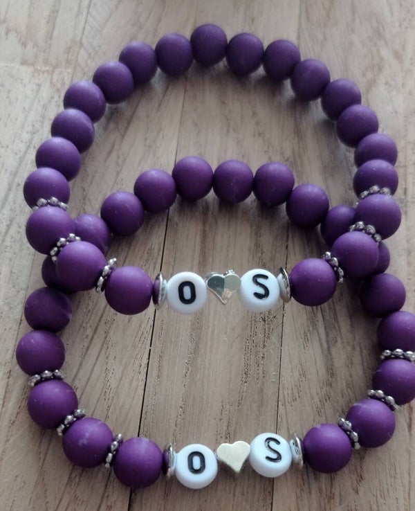 Partnerarmband in Lila mit einem Herz und zwei Buchtaben aus Acrylperlen.