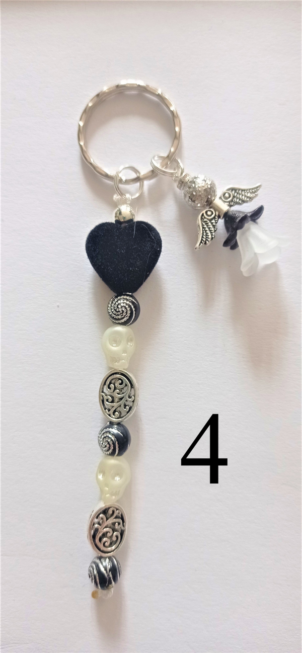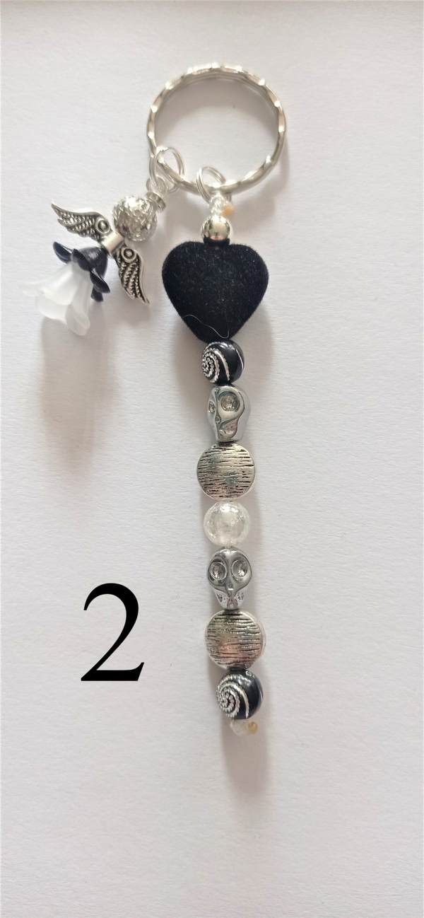 Schlüsselanhänger mit einer Herzperle aus Samt, einem Schutzengel und Metallperlen.