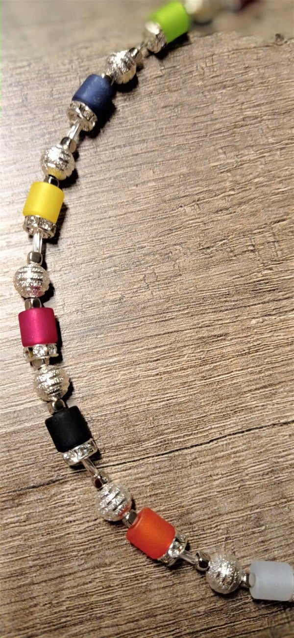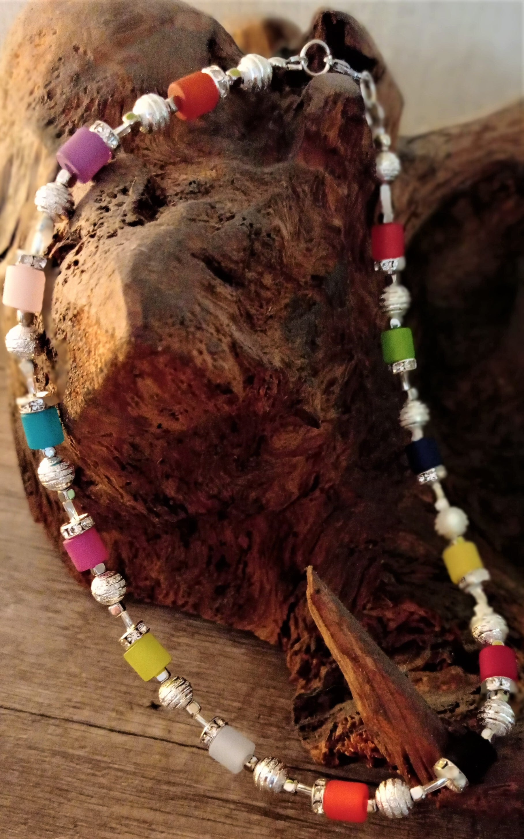 Schönes, buntes Collier aus Polaris-Röhren, Spacer-Rondell Strass, silberne Metallperlen und mit einem Karabinerverschluss.
