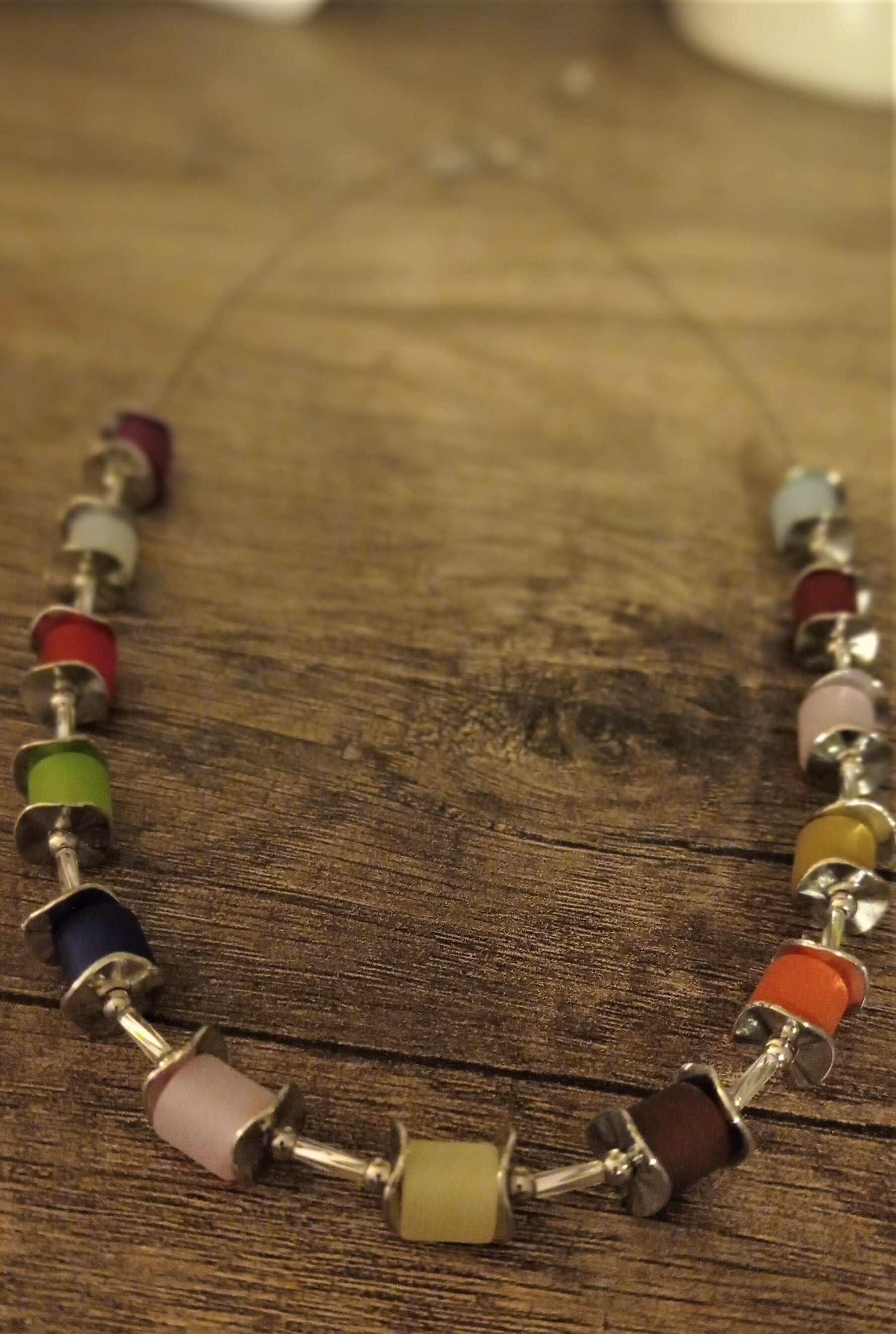 Collier aus Polarisröhren, abgesetzt mit Scheiben-Spacer in Silber.