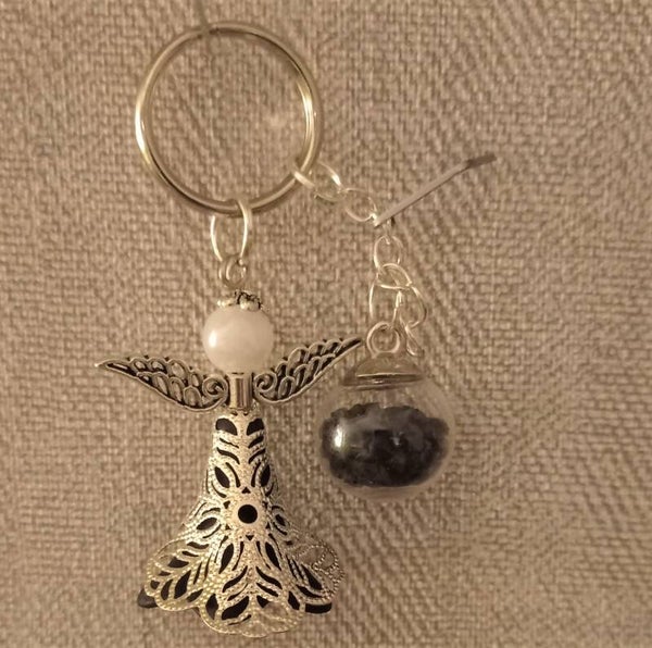 Schutzengel als Schlüsselanhänger aus Acryl- und Aluminiumblüte, mit einer gefüllten Glaskugel