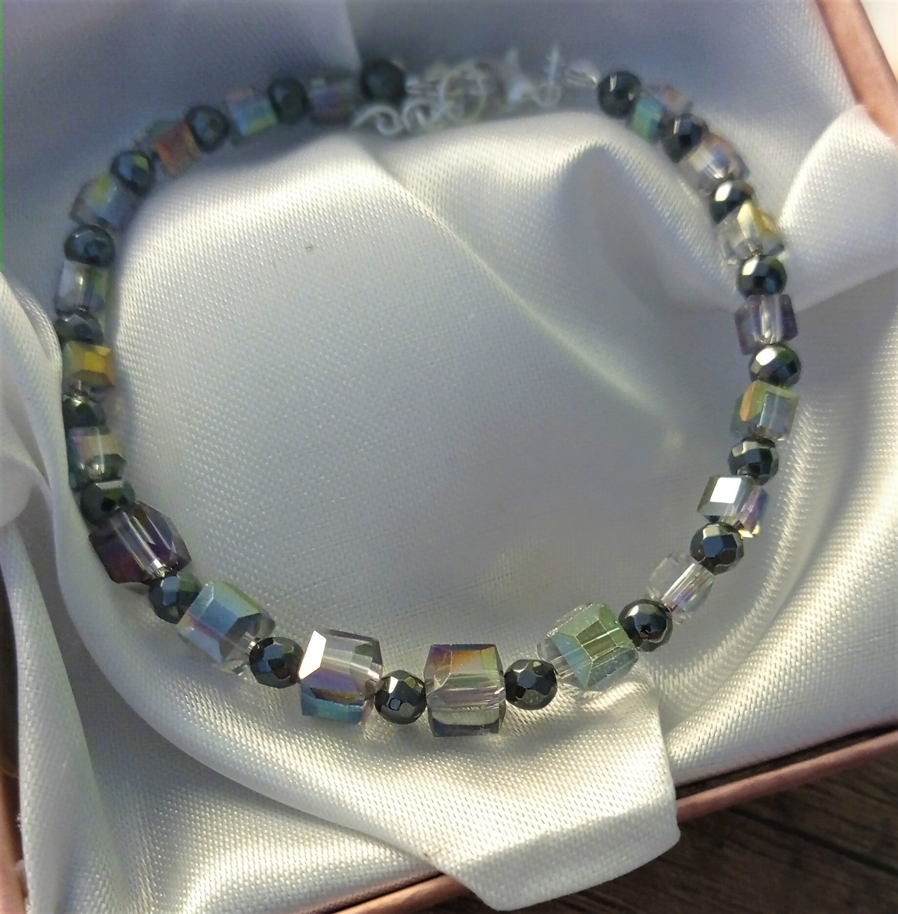 Armband aus Glaswürfeln, in einer keinen Schmuckbox
